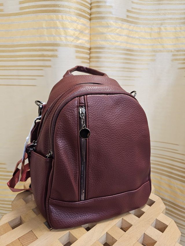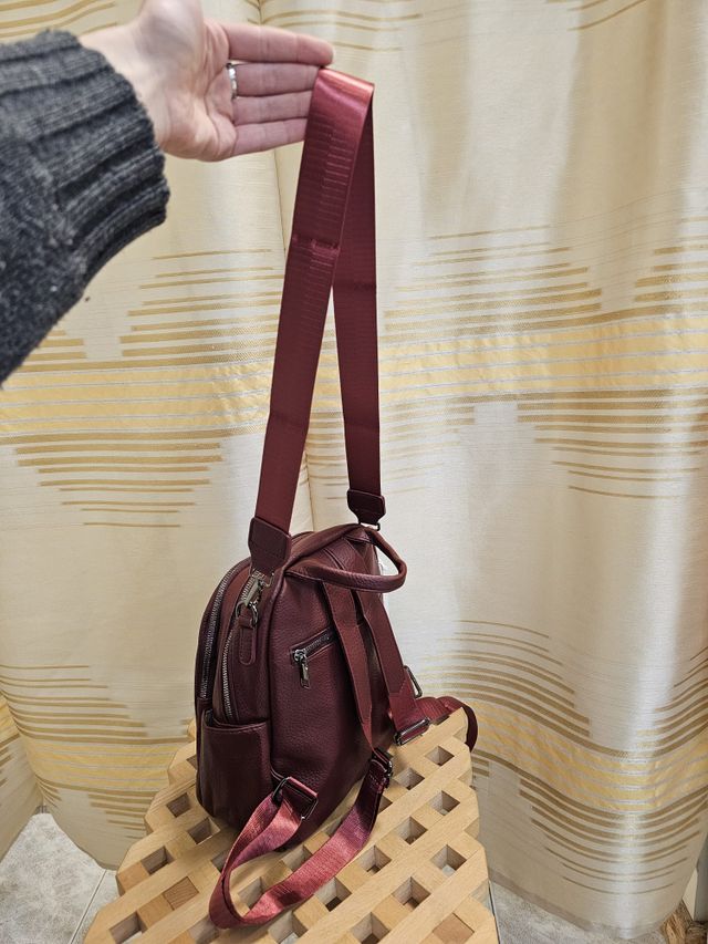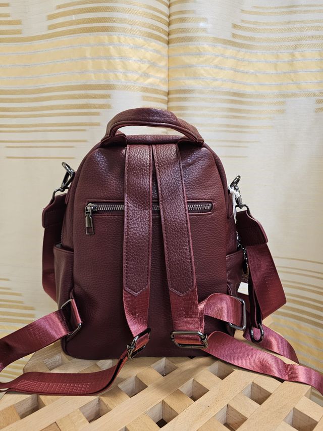 Zainetto in ecopelle bordeaux con spalline regolabili e tracolla removibile.