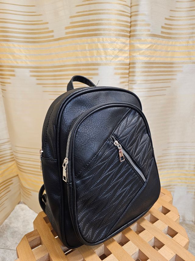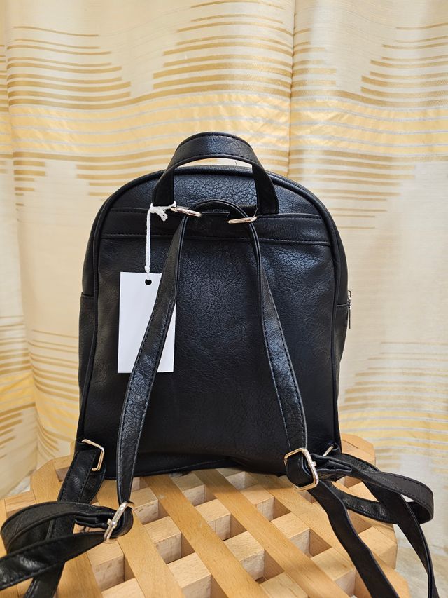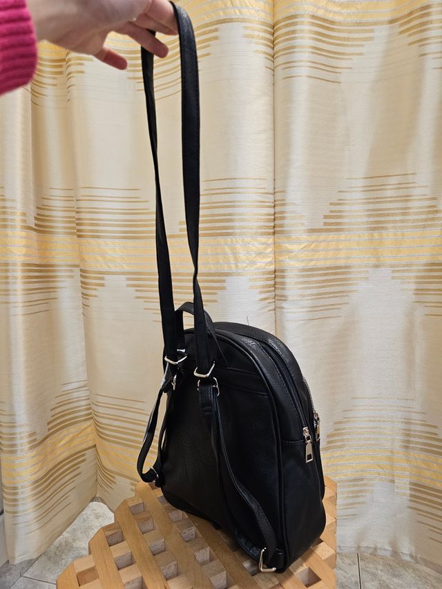 Zainetto in ecopelle nera con spalline regolabili e trasformabili in tracolla. Misure: 32x35 cm