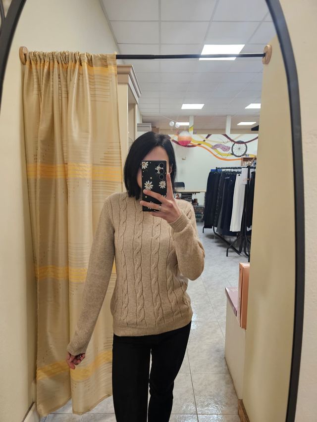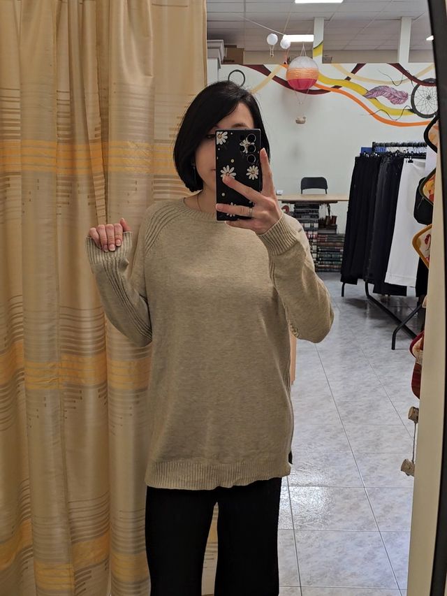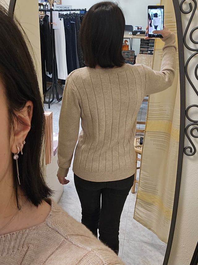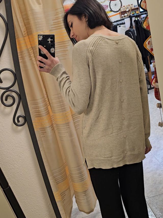 Maglione girocollo con bordo a costine beige con spacchetti laterali e bottoncini sul retro. Taglia unica. Composizione: 50% viscosa, 30% Poliammide, 20% nylon