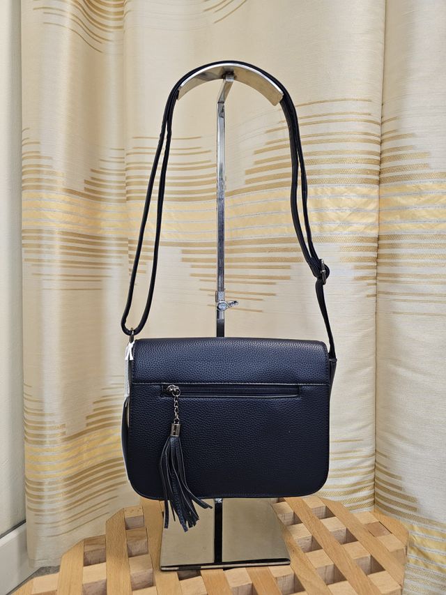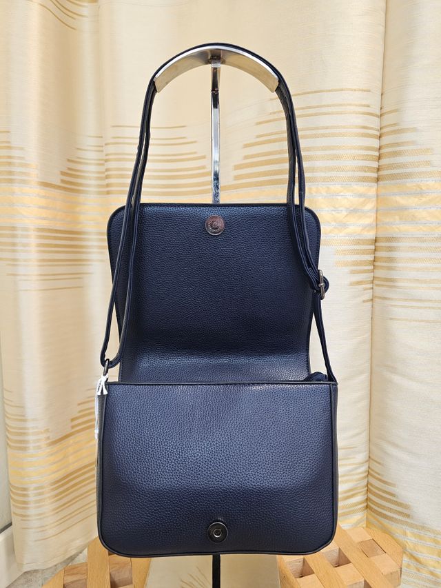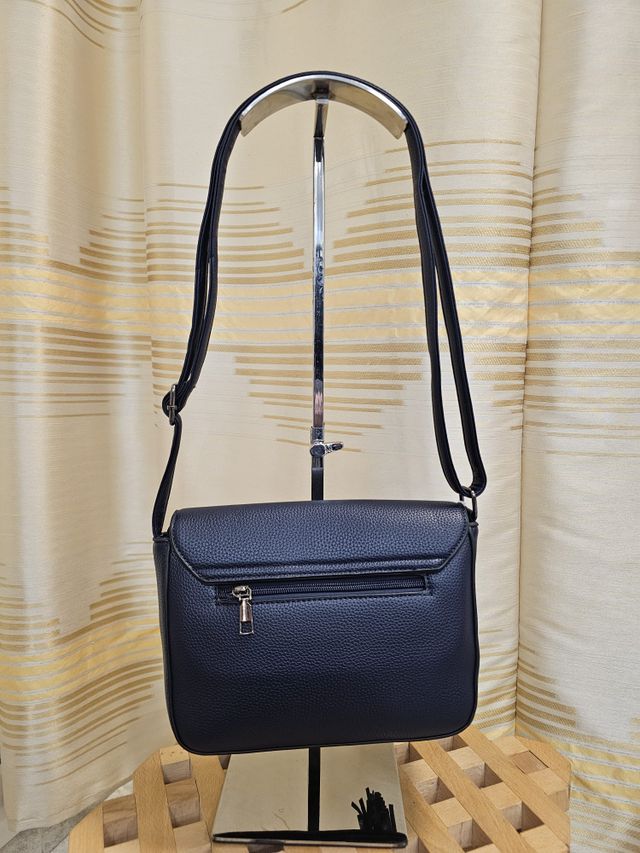 Borsetta a tracolla regolabile in ecopelle blu, con chiusura magnetica frontale e zip interna.
