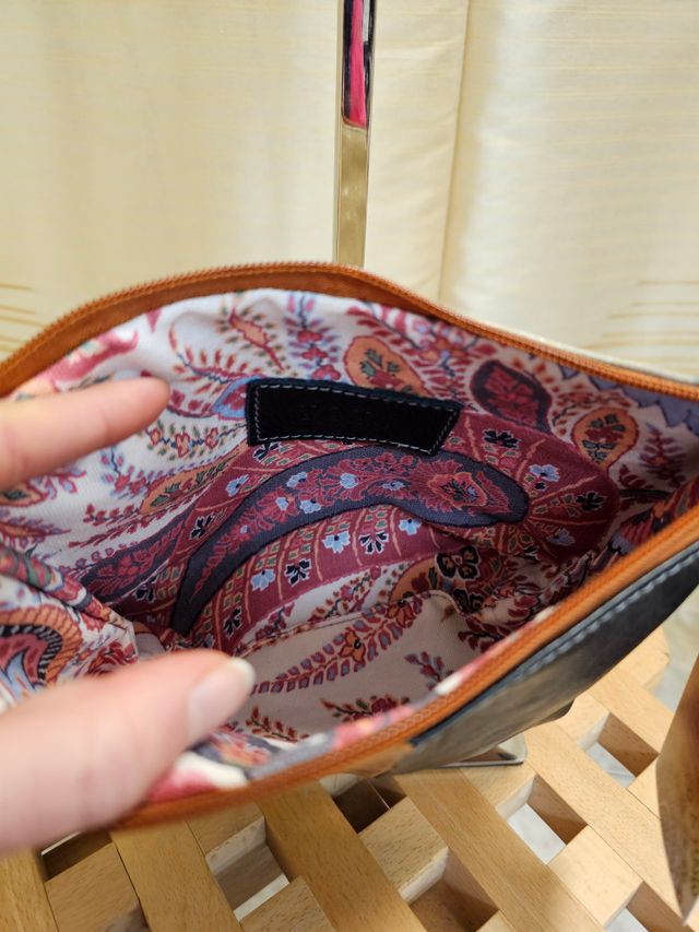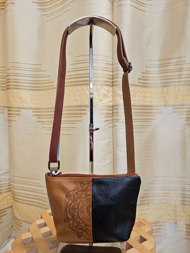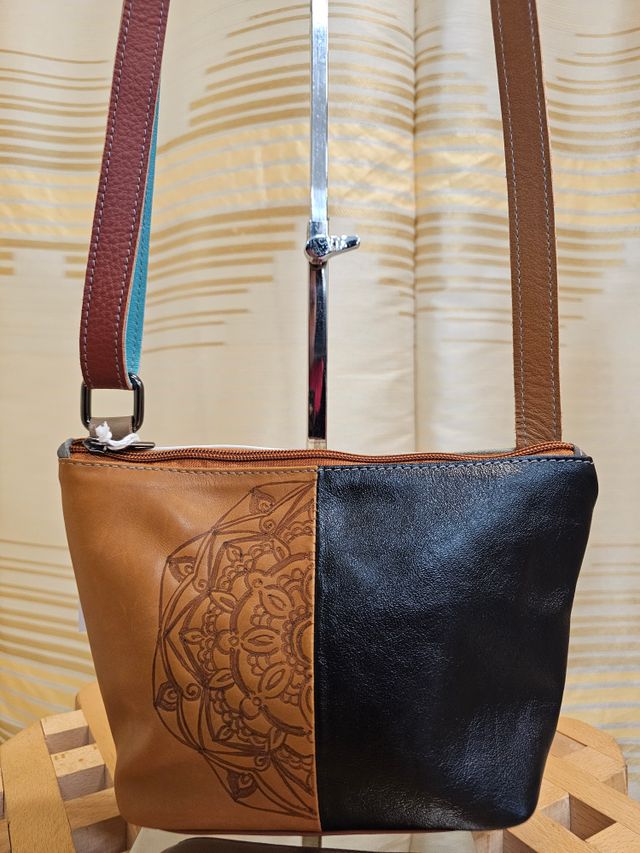 Borsetta a tracolla regolabile in vera pelle multicolor pirografata a mano. Pezzo unico. Misure: 16x24 cm