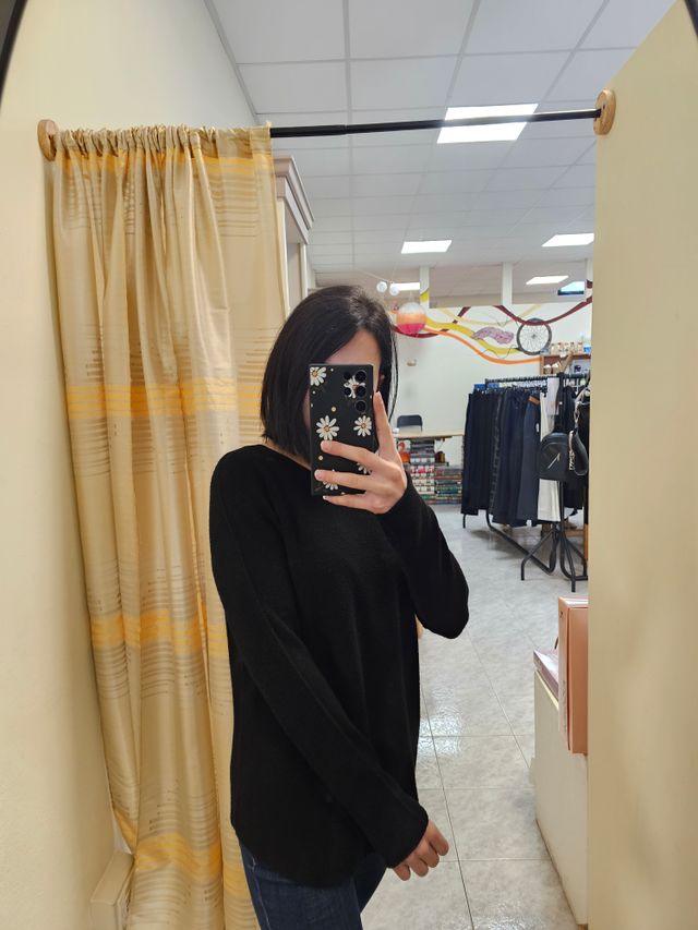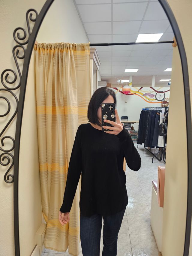 Maglione con scollo a barchetta nero con cucitura sulle maniche. Taglia unica. Composizione: 50% viscosa, 28% poliestere, 22% nylon