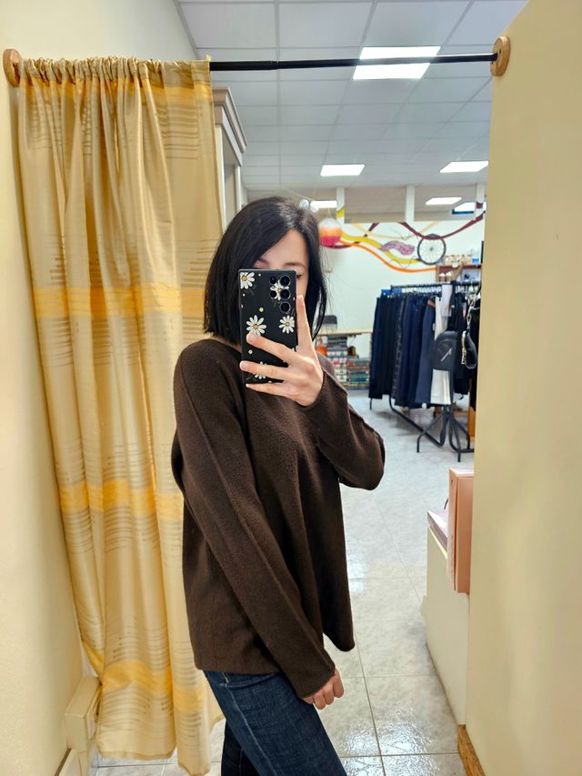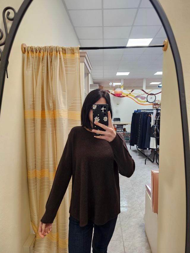 Maglione con scollo a barchetta color cioccolato con cucitura sulle maniche. Taglia unica. Composizione: 50% viscosa, 28% poliestere, 22% nylon