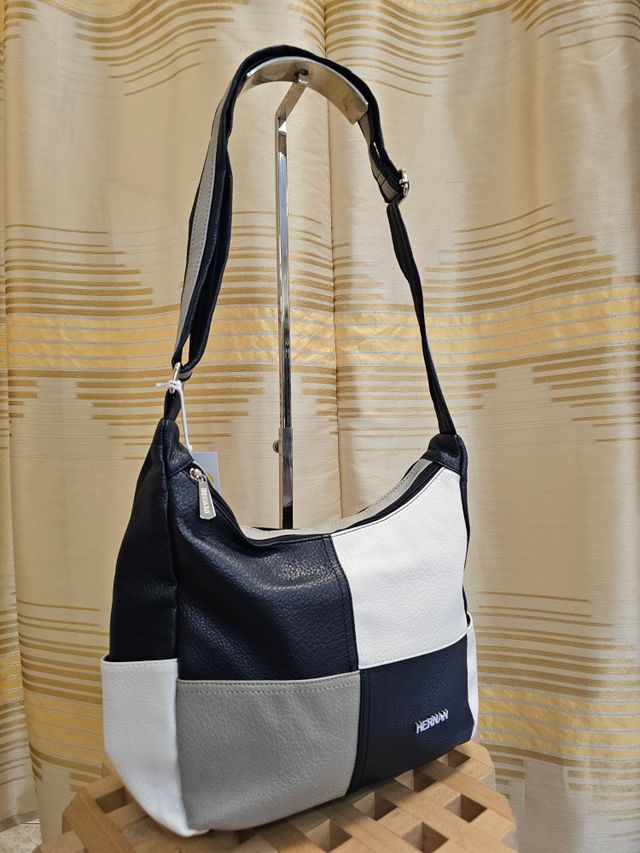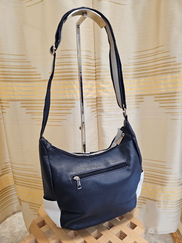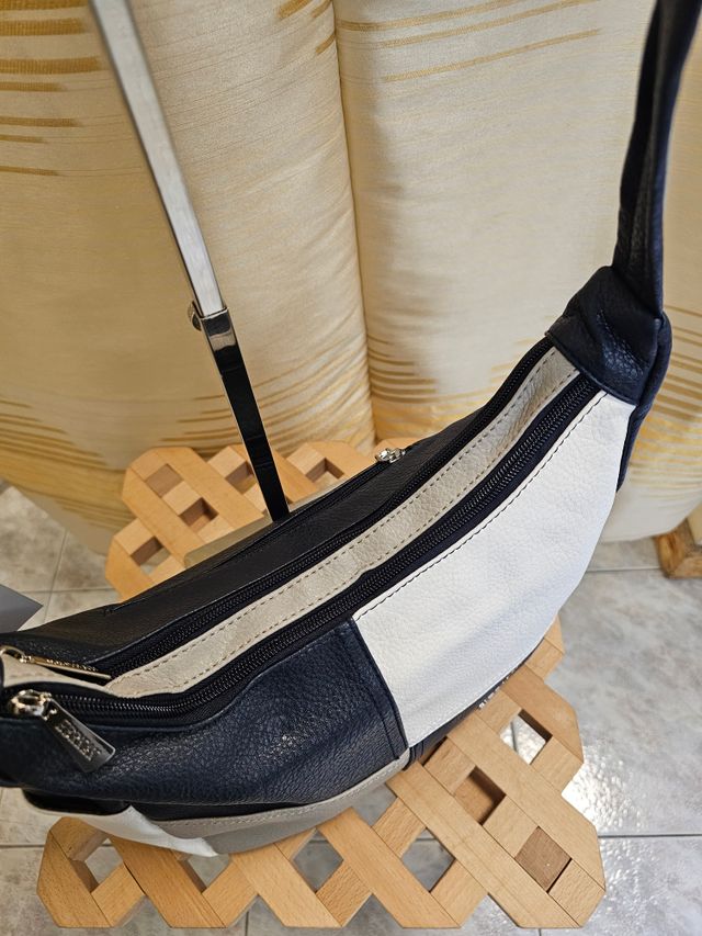 Borsa a tracolla regolabile in ecopelle blu, bianca e grigia. Misure: 22x35 cm