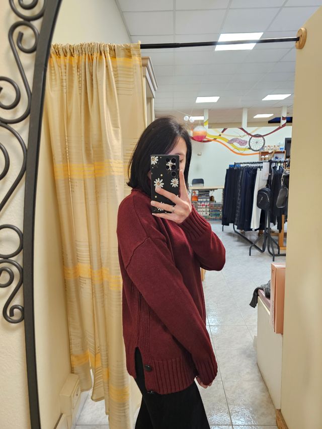 Maglione dolcevita con bordo a costine bordeaux con spacchetti laterali e bottoni. Taglia unica.