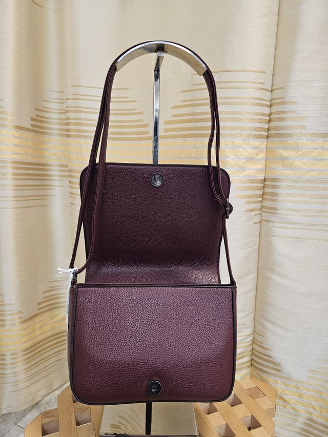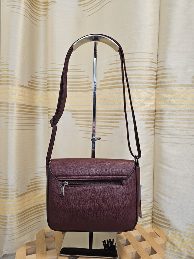 Borsetta a tracolla regolabile in ecopelle bordeaux, con chiusura magnetica frontale e zip interna.
