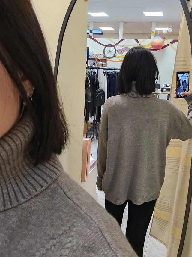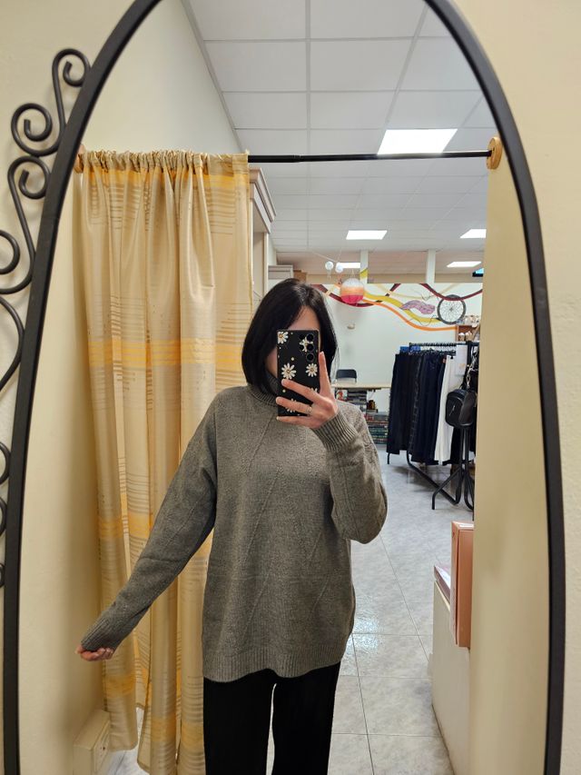 Maglione dolcevita grigio con losanghe sul davanti.