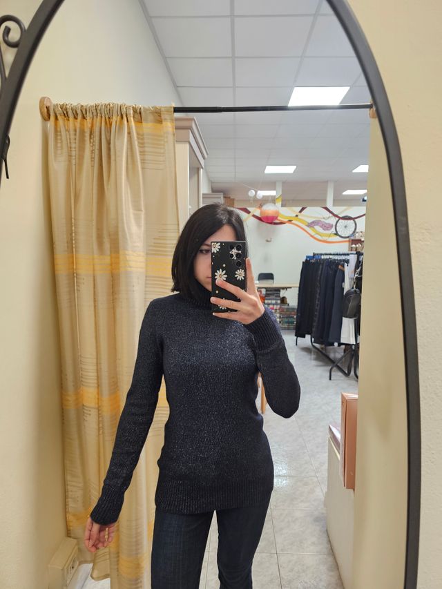 Maglione dolcevita liscio blu con lurex. Taglia unica. Composizione: 48% viscosa, 24% poliestere, 18% poliammide, 10% metallo
