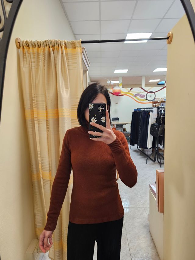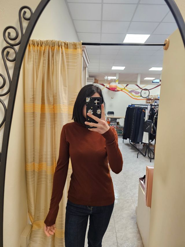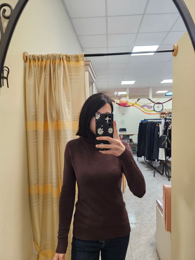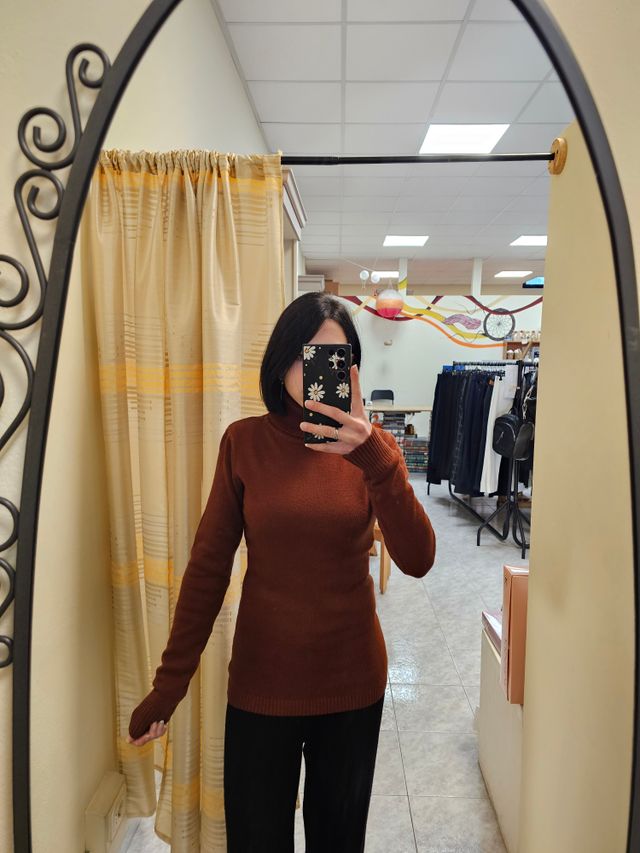 Maglione dolcevita liscio color gianduia. Taglia unica. Composizione: 45% viscosa, 28% nylon, 27% poliammide