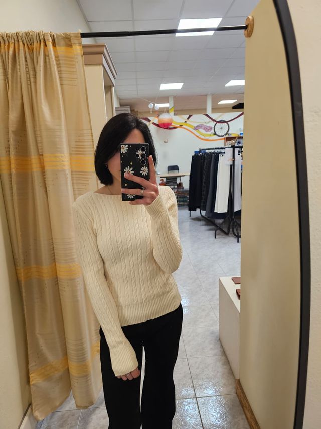 Maglione a girocollo panna con trecce.