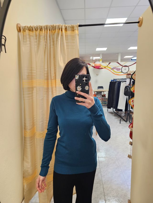 Maglione dolcevita liscio verde petrolio. Taglia unica. Composizione: 45% viscosa, 27% poliestere, 23% nylon, 5% modal