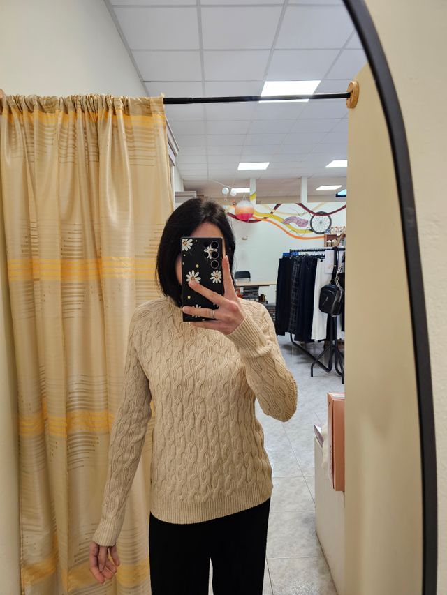 Maglione a girocollo beige con trecce. Taglia unica. Composizione: 50% viscosa, 40% Poliammide, 10% elastan